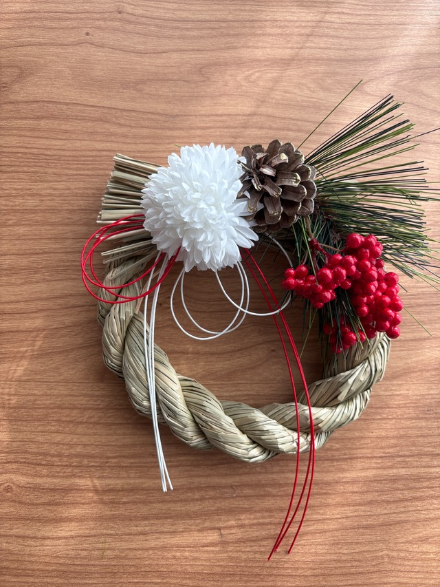 ライブ配信または動画をご覧いただきながら お作りいただけるしめ縄キット。 白のピンポンマムと松かさをつかった 紅白の水引が印象的な お正月のシンプルモダンなしめ縄飾りです。 コンパクトでセンスのいいお飾りを ご自分の手で作って楽しんでいただけます。 輪の部分は直径約16センチ、 横の最大幅は18センチほどです。 控えめで上品な仕上りです。 挿すだけで仕上がりますが 木工用ボンドやホットグルーで 根元を止めていただくと落ちて こないので便利です。 玄関ドアだけでなく、 リビングの壁や玄関のコーナーなどに 飾ってもおしゃれです。 ご購入完了後、個別に zoomリンクをお知らせします。 ご予定の合わない方は 終了後に録画をお送りしますので ご覧ください。 ぜひ一緒に手作りを楽しみましょう! なお、完成品も同じ価格で購入いただけます。 ご希望の方はその旨を 注文時にお知らせください。